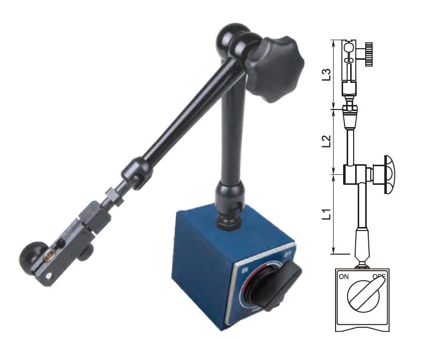 Baza magnetica este prevazuta cu o canelura in V la 150°, ceea ce permite fixarea stabila nu doar pe suprafete plane (precum platforme din fonta), ci si pe suprafete cilindrice. Comutatorul On/Off faciliteaza mutarea bazei fara a afecta forta magnetica sau suprafata de lucru.