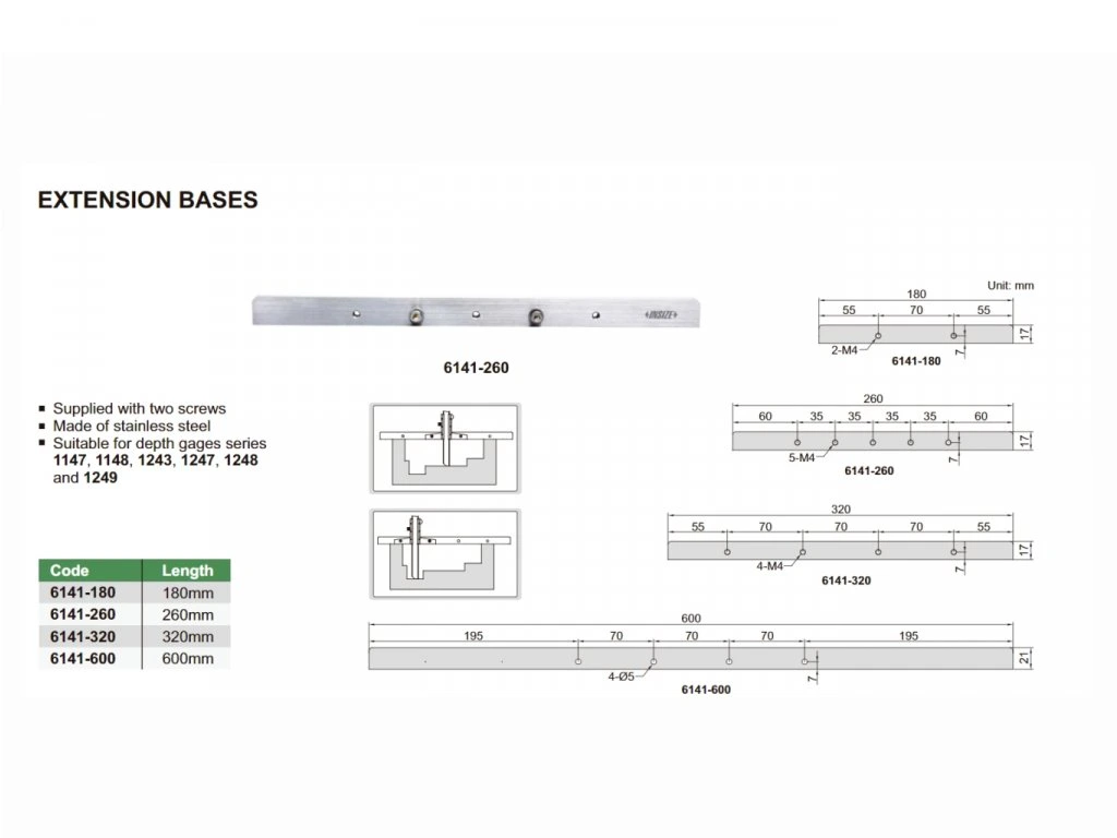 Extensia de baza INSIZE este un accesoriu esential pentru sublerele de adancime, ideala pentru masuratori precise si stabilitate suplimentara. Fabricata din otel inoxidabil de inalta calitate, aceasta are o lungime de 260 mm si latime de 17 mm, asigurand durabilitate si rezistenta in utilizare.