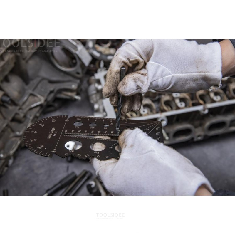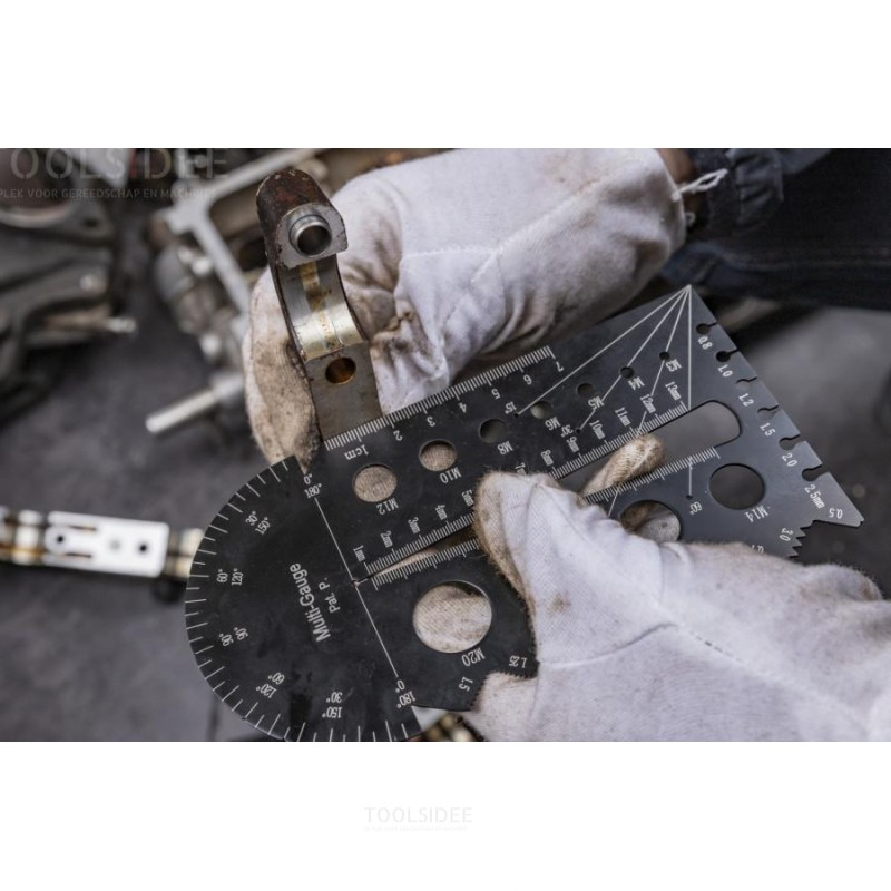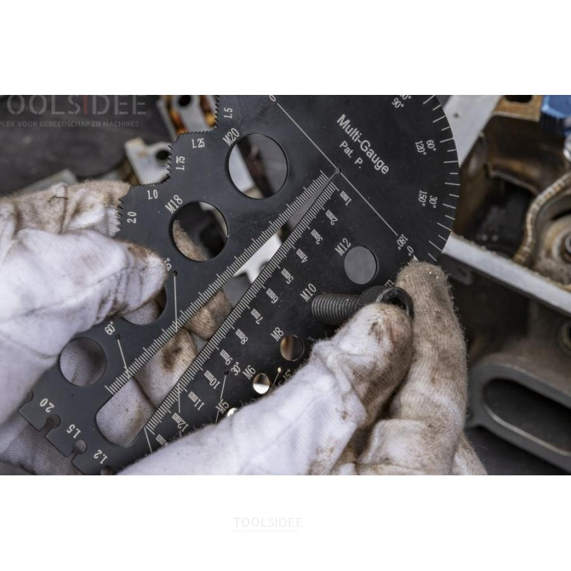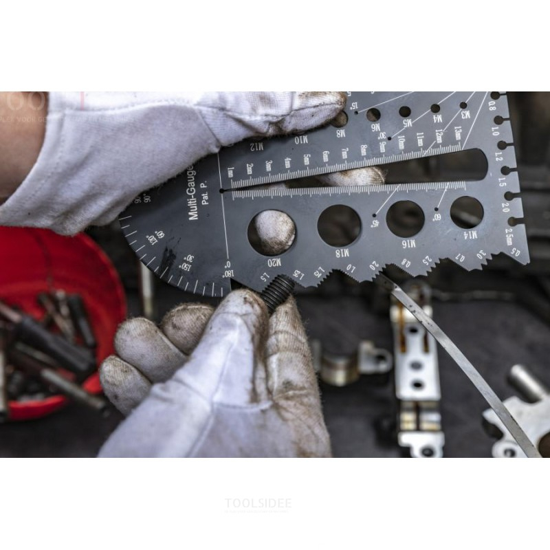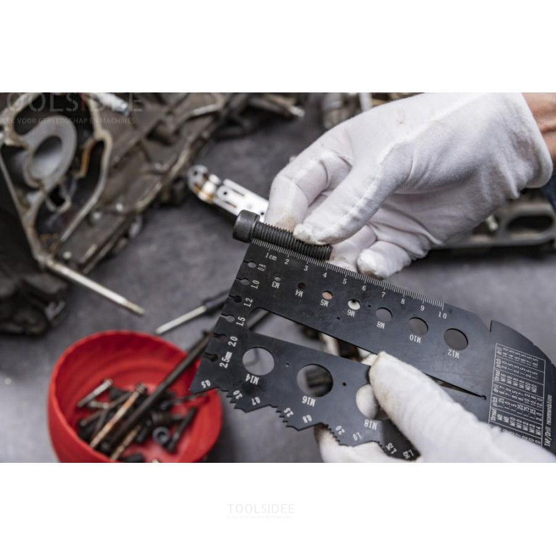 Sablonul multifunctional Dasqua este un instrument profesional de verificare si masurare conceput pentru precizie ridicata in ateliere mecanice, controlul calitatii si montajul industrial. Fabricat din otel inoxidabil cu prelucrare CNC si finisaj sablat cu gravura laser contrastanta, acest sablon permite verificarea pasului filetelor, identificarea diametrului suruburilor, masurarea grosimii saibelor/sarmei si determinarea precisa a diametrului intern al gaurilor de burghiu.