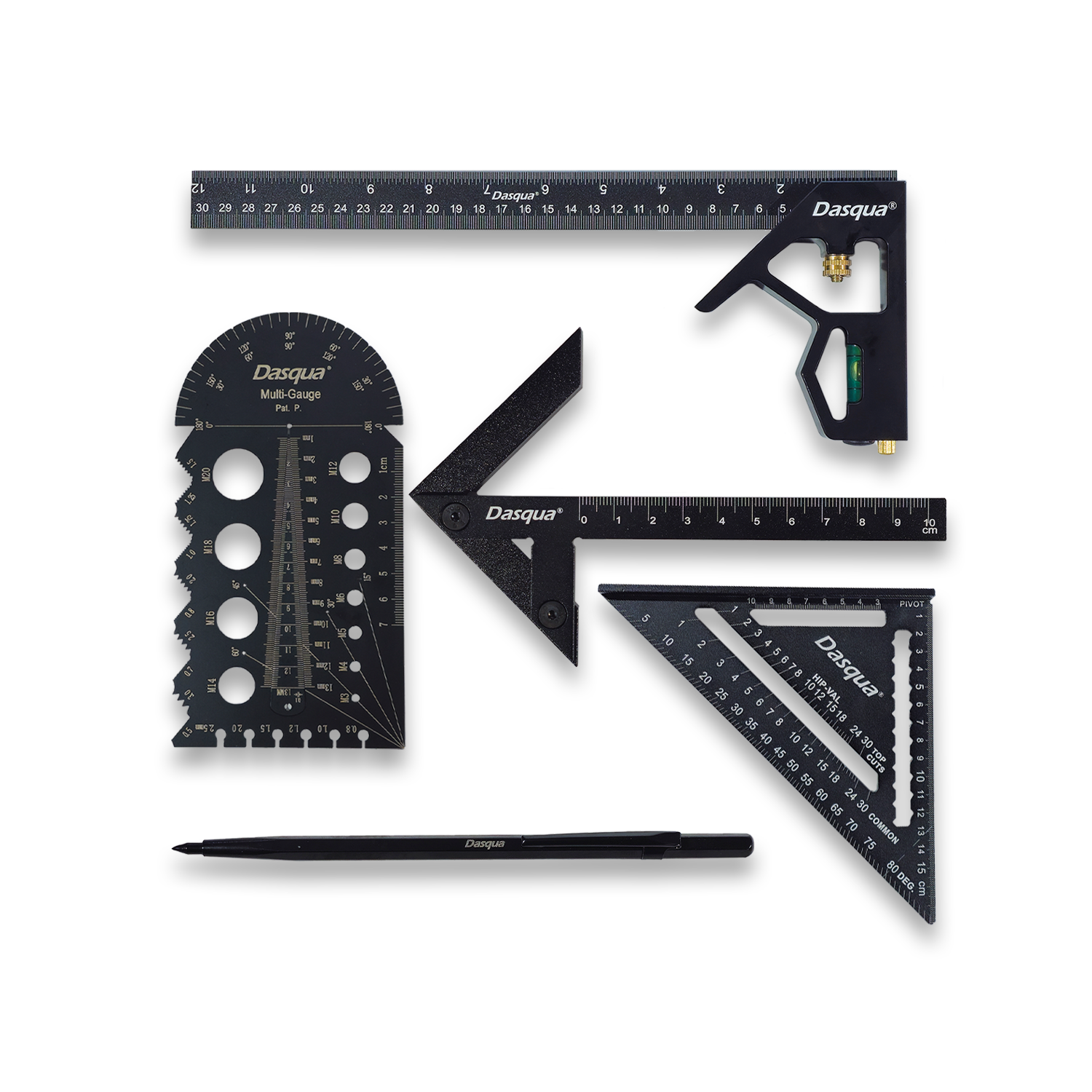 Set profesional Dasqua format din 5 instrumente esentiale pentru masurare, verificare si trasare de precizie, fabricate 100% pe masini CNC pentru uniformitate si acuratete maxima. Fiecare piesa este realizata din materiale premium, cu marcaje gravate laser si finisaj anodizat negru, oferind durabilitate, rezistenta la coroziune si precizie constanta in aplicatii industriale.