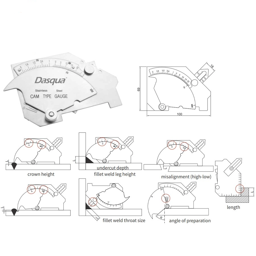 Sablonul de sudura Dasqua este un instrument profesional, proiectat pentru inspectia vizuala si dimensionala a sudurilor. Fabricat din otel inoxidabil de inalta calitate, cu finisaj satin cromat si gravuri laser clare, acest sablon ofera o metoda rapida si precisa pentru evaluarea unghiului de pregatire, a dimensiunii cordonului, a grosimii gatului de sudura, a denivelarilor si a adancimii subtaierii (undercut).