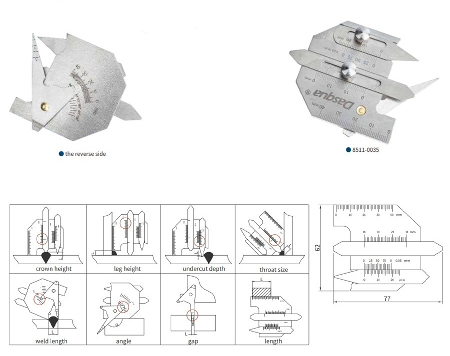 Sablonul calibru de sudura Dasqua este un instrument de masura versatil, fabricat din otel inoxidabil. Este conceput pentru a masura o varietate de parametri ai sudurii, cum ar fi inaltimea, latimea, unghiul, decalajul si adancimea subtiata. Acest instrument are o suprafata tratata cu crom satinat, calit si slefuit, pentru o rezistenta sporita. Sablonul este alcatuit din patru componente: o scala principala, un calibru de inaltime, un calibru pentru adancimea subtiata si un calibru multifuncional.