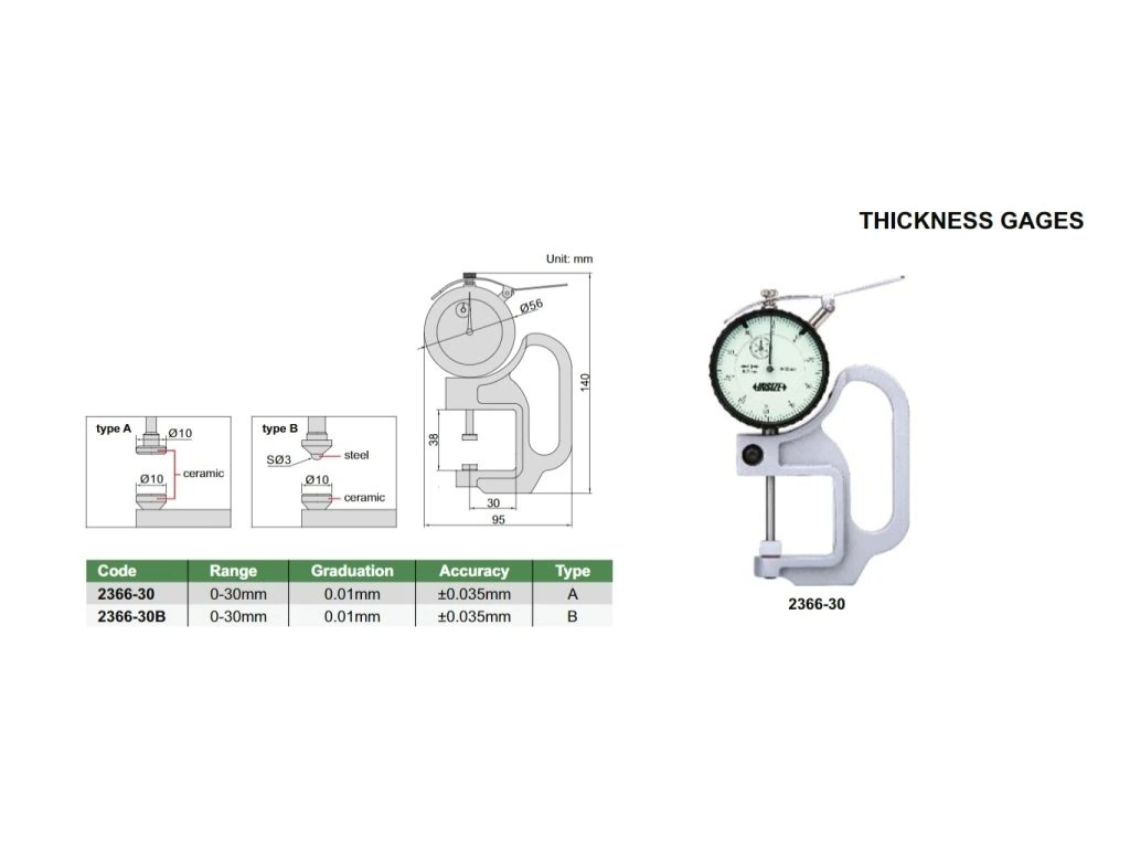 Ceas comparator mecanic pentru grosimi INSIZE, cu un domeniu de 0-30 mm si rezolutie de 0,01 mm. Are varfuri de masurare plate din ceramica, ideal pentru masuratori rapide si precise.