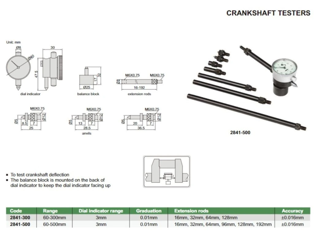 Testerul de arbore cotit INSIZE 60-500 mm este un instrument profesional destinat verificarii deformarii arborelui cotit in aplicatii de service, mecanica si mentenanta industriala. Sistemul este prevazut cu un bloc de echilibrare montat pe spatele ceasului comparator, asigurand stabilitate crescuta si precizie constanta in timpul masuratorilor. Constructia robusta si configuratia modulara permit adaptarea rapida la lungimi variate prin utilizarea tijelor de extensie incluse.