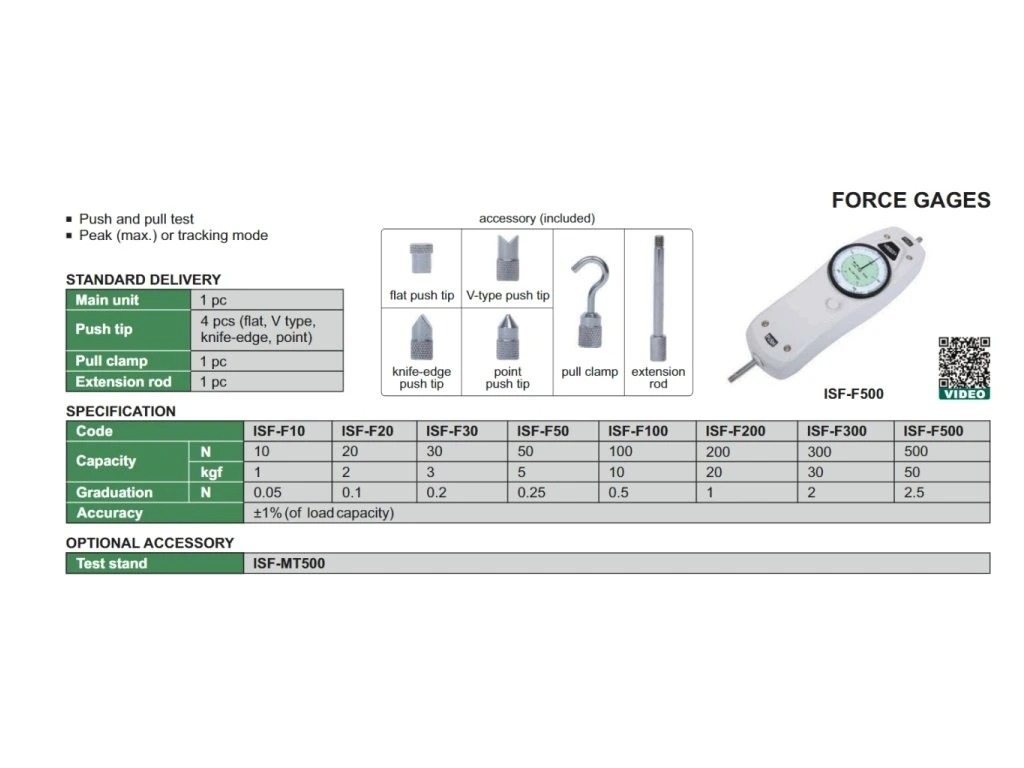 Pachetul include o tija de extensie si 5 accesorii interschimbabile, care permit efectuarea de masuratori diverse (impingere/presiune). Pentru testari stationare si repetabile, dinamometrul poate fi montat pe un stand de testare optional (ex: ISF-MT500).