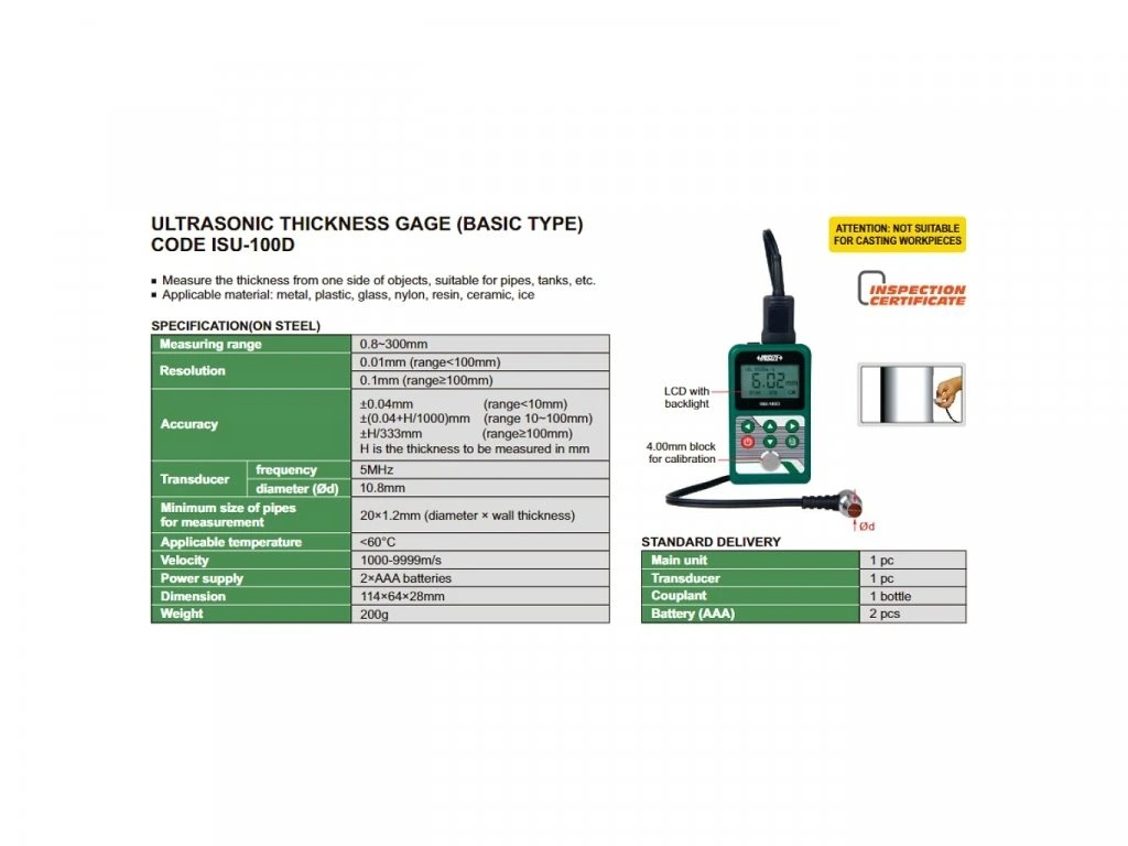 Aparatul ultrasonic INSIZE ISU-100D este un instrument de inalta precizie conceput pentru masurarea grosimii materialelor atunci cand accesul este permis pe o singura parte a obiectului. Aceasta tehnologie il face indispensabil pentru verificarea uzurii sau a grosimii peretilor la tevi, rezervoare, carcase de utilaje si alte structuri inchise.