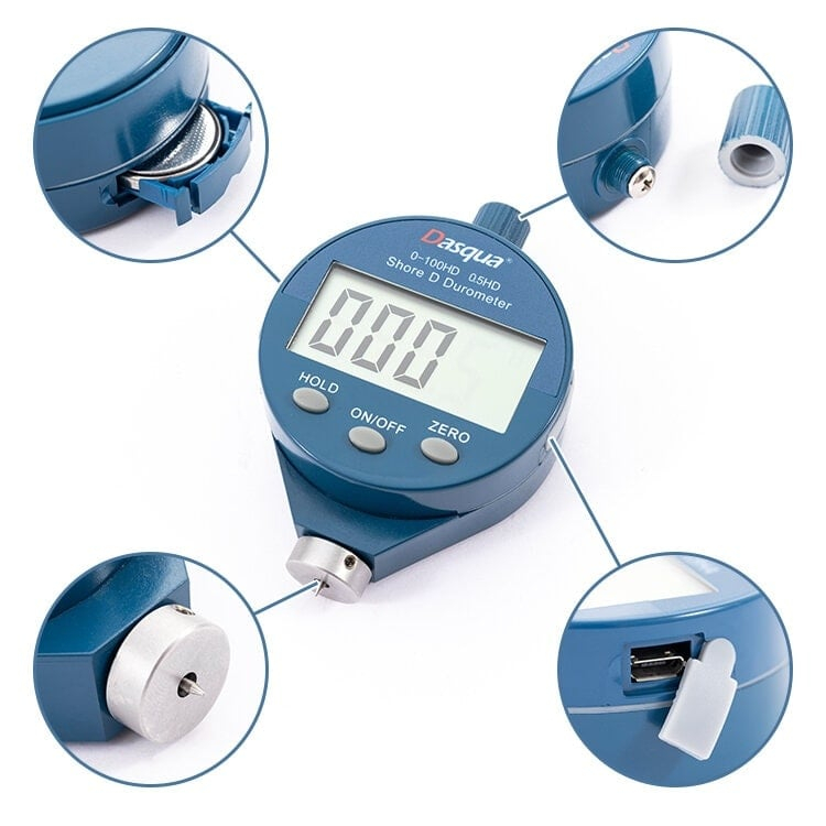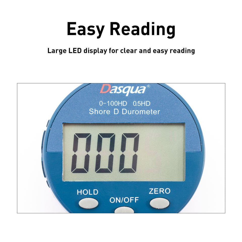Durometrul digital Shore D Dasqua este un instrument portabil de înaltă precizie, conceput pentru testarea durității materialelor dure, precum cauciucul dur, materialele plastice termoplastice, bilele de bowling și pardoselile din plastic.