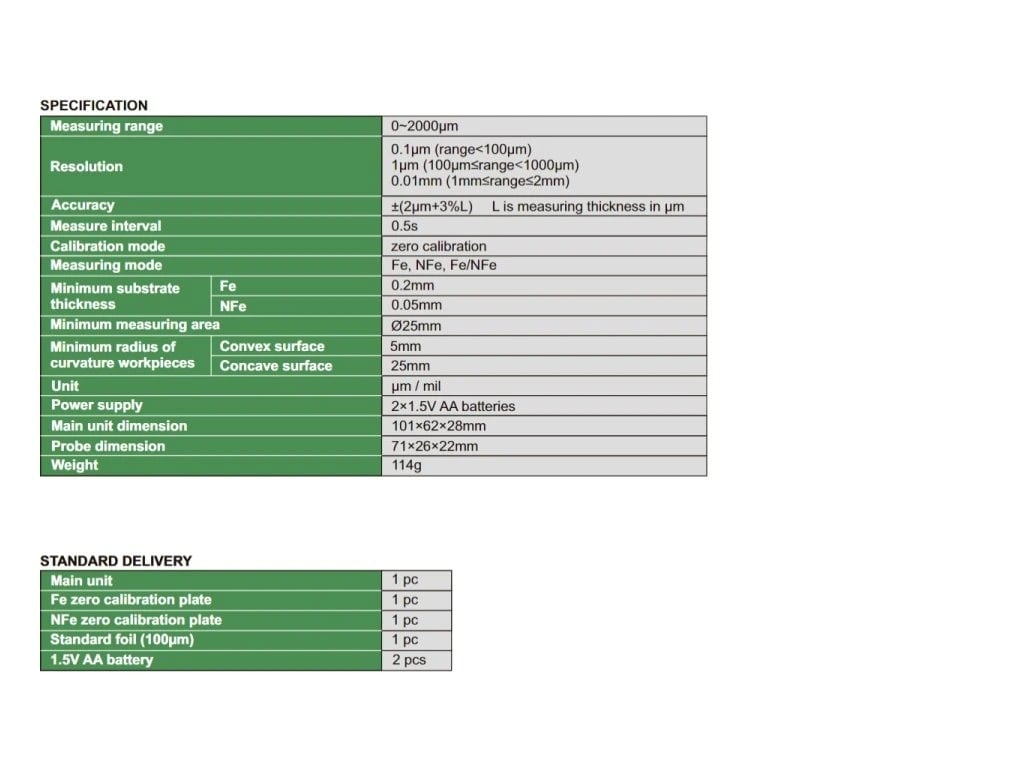 Echipat cu o sonda universala cu palpator din rubin pentru durabilitate si precizie, aparatul se remarca prin timp scurt de masurare (0,5 s), rezolutie ridicata de pana la 0,1 µm, si precizie ±(2 + 3%L) µm. Este ideal pentru verificarea straturilor de vopsea, pulberi, materiale plastice, galvanizare sau anodizare.