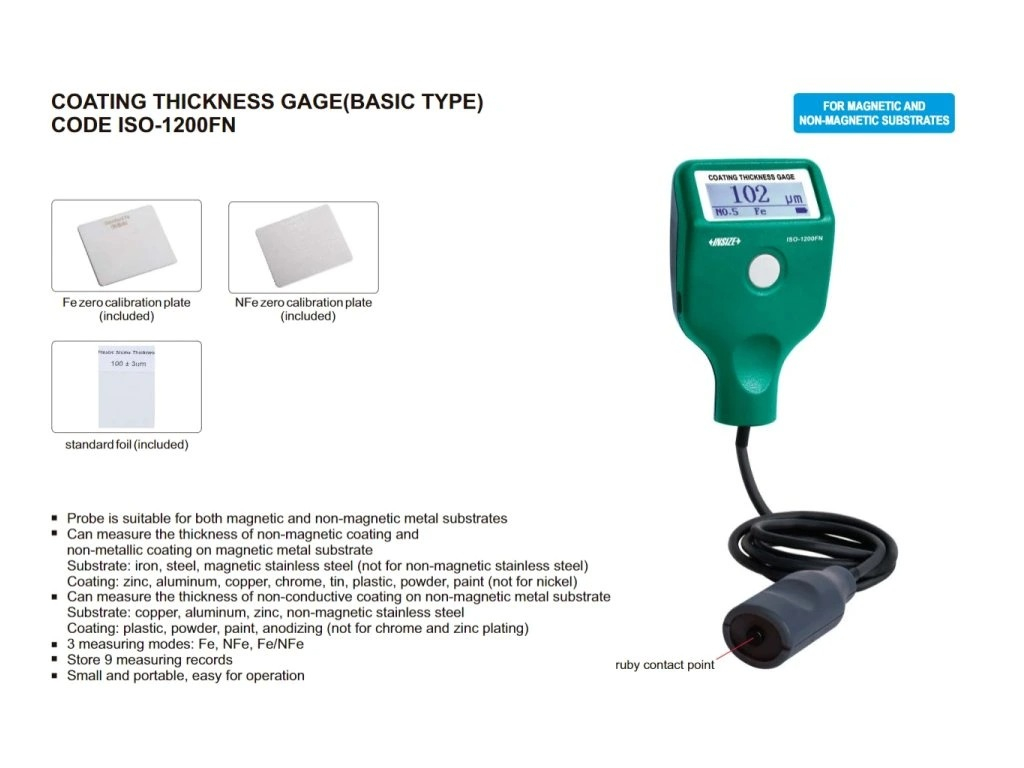 Aparatul de masurat grosimea stratului de acoperire INSIZE 0–2000 µm este un instrument profesional destinat determinarilor precise ale grosimii straturilor nemetalice si nemagnetice depuse pe substraturi metalice. Acesta poate masura atat pe baze magnetice (Fe), cat si pe baze nemagnetice (NFe), oferind de asemenea un mod combinat Fe/NFe pentru identificare automata a tipului de substrat.