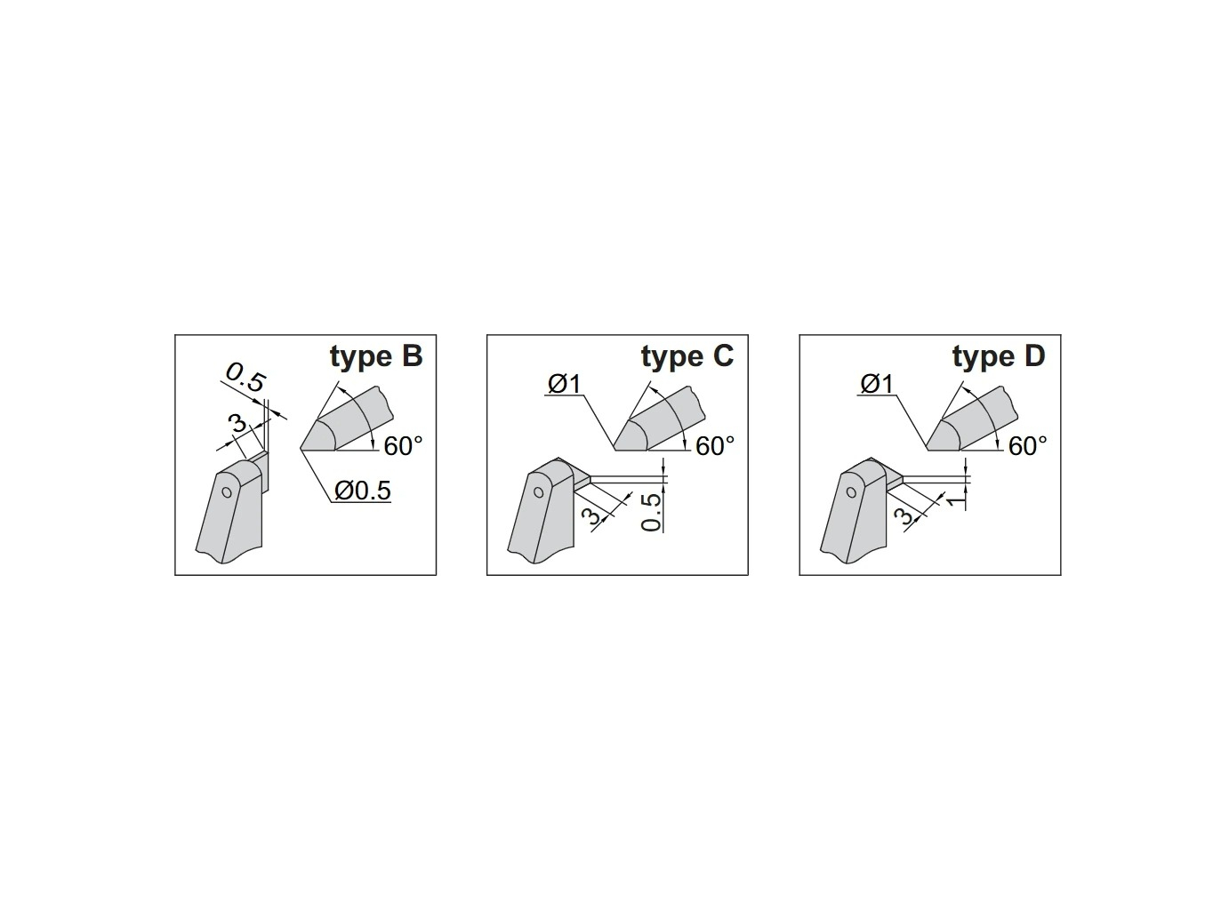 Tip varfuri: C (Stanga: plat 3 mm | Dreapta: conic 60 grade / Ø1)