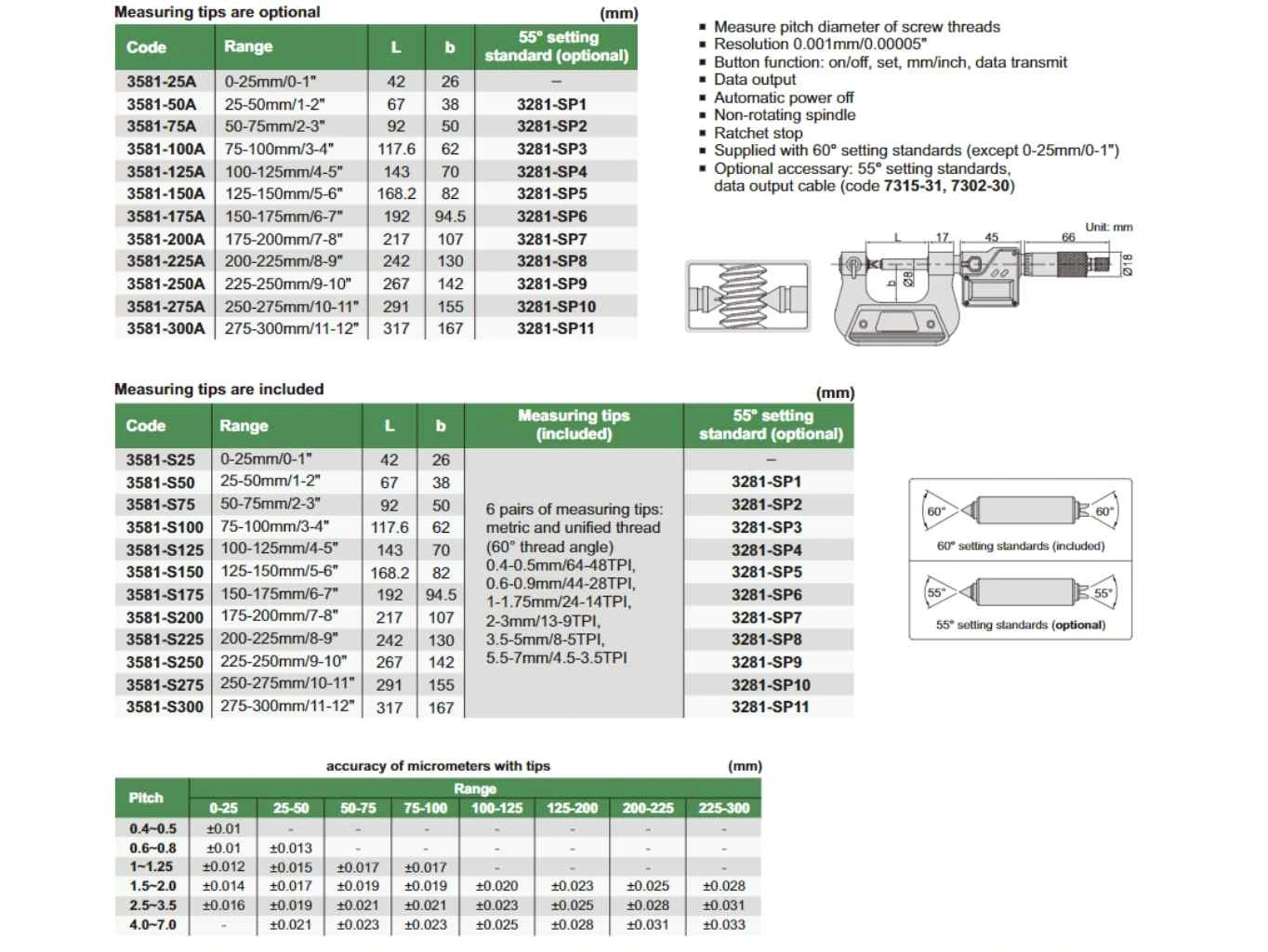 Micrometrul digital INSIZE din seria 3581, este un instrument de top conceput pentru laboratoarele de control si atelierele de productie care necesita o precizie de 1 micron (0,001 mm). Avantajul major al acestui model este arborele fix, nerotativ, care asigura pozitionarea varfurilor pe flancurile filetului fara forfecare, garantand astfel o precizie repetabila si eliminand riscul de a marca piesa masurata.
