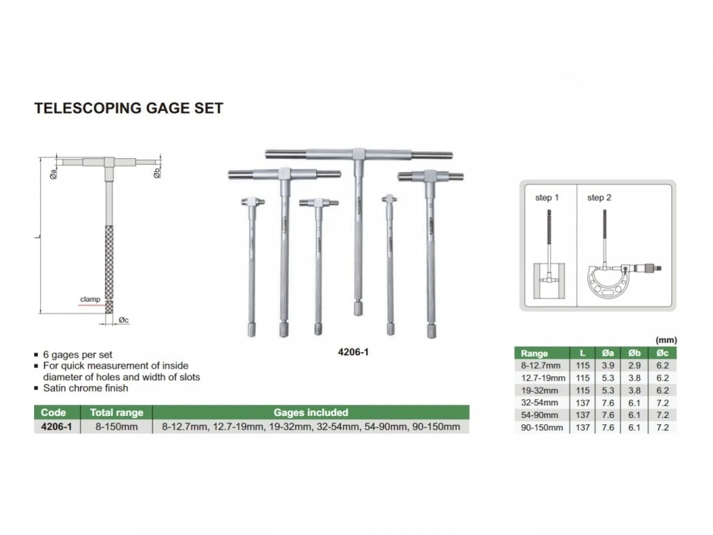 Setul acopera un interval total de masurare de la 8 mm pana la 150 mm, fiind potrivit pentru majoritatea aplicatiilor din ateliere si metrologie. Fiecare tija individuala dispune de un arc de auto-centrare, asigurand ca instrumentul se pozitioneaza corect in gaura pentru o masurare fidela.