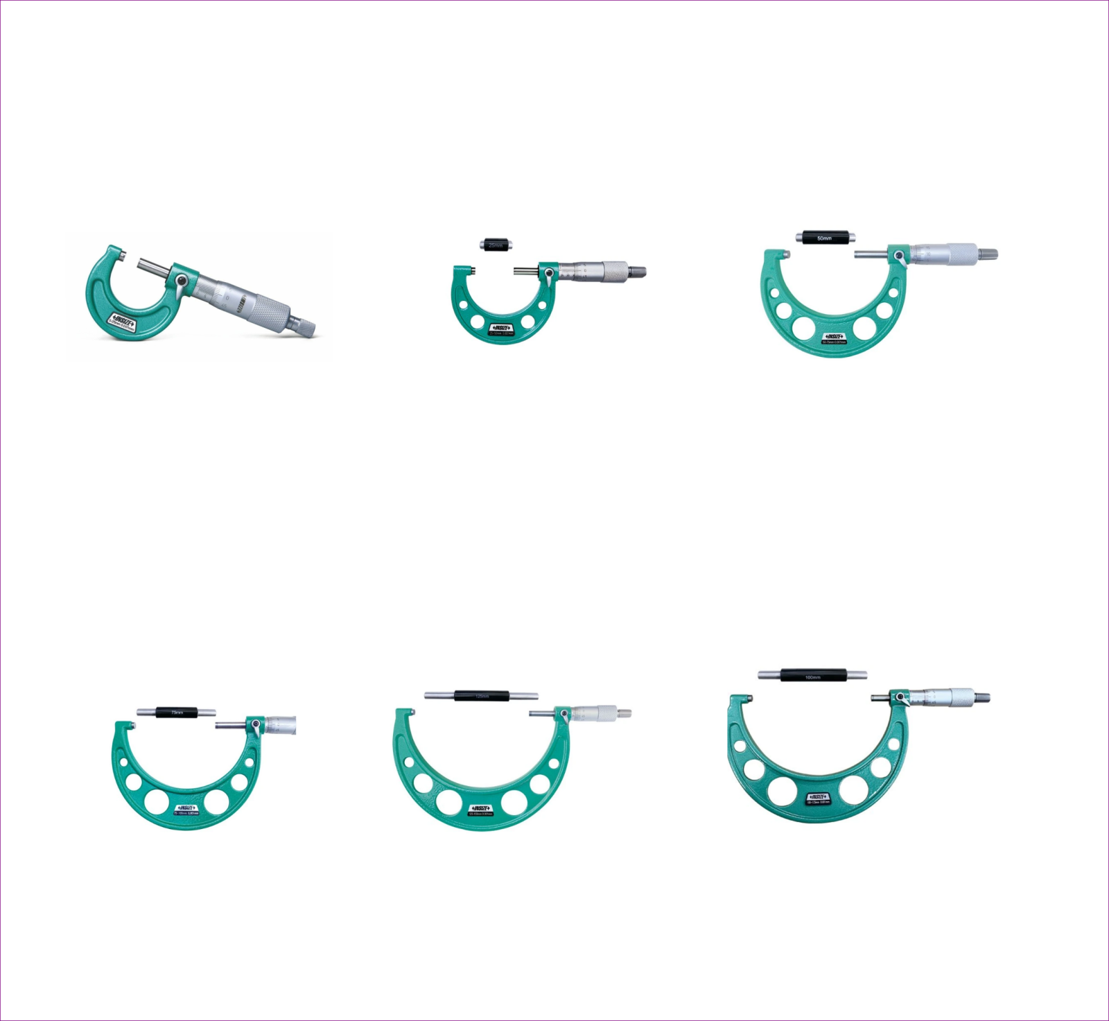 Set de sase micrometre mecanice de exterior INSIZE, seria 3210, cu interval 0–150 mm si rezolutie 0,001 mm, conceput pentru masuratori de inalta precizie. Suprafetele de masurare sunt din carbura, iar clichetul integrat permite strangere uniforma pentru rezultate exacte. Conform DIN863-1.
