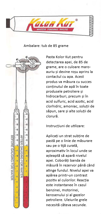 Pasta pentru detectia apei Kolor Kut este un indicator simplu si eficient, util pentru determinarea nivelului apei din rezervoare, cisterne si tancuri. Este deosebit de utila pentru a masura grosimea stratului de apa aflat sub produse petroliere rafinate sau nerafinate, inclusiv in combustibilii imbogatiti cu etanol sau metanol. Acest produs original, fabricat in SUA, este un instrument esential pentru controlul calitatii si sigurantei combustibililor, inclusiv in aviatie. Initial, pasta este de culoare maro-auriu, iar la contactul cu apa, devine un rosu aprins, oferind o indicatie vizuala clara si precisa a nivelului de apa prezent.