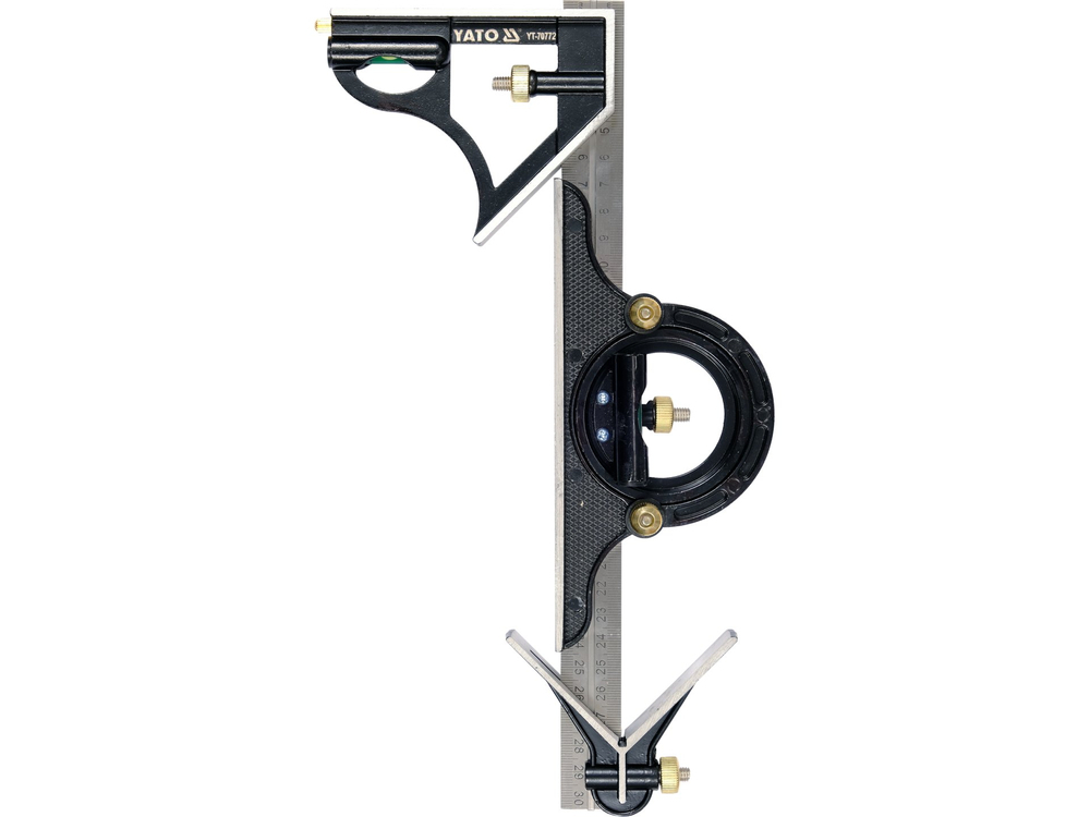 Setul combinat de 4 piese este un instrument multifunctional destinat masuratorilor de precizie in atelier, constructii metalice, prelucrare lemn, mecanica fina si aplicatii DYI. Include rigla de 300 mm, cap echer cu planuri de masurare la 45° si 90°, cap raportor rotativ cu domeniu 0-180° si cap de centrare pentru localizarea punctului central. Corpurile pentru raportor si centrare sunt fabricate din aluminiu turnat, asigurand rigiditate si durabilitate. Setul permite masuratori unghiulare, trasari, verificari de perpendicularitate si centrare cu acuratete ridicata.