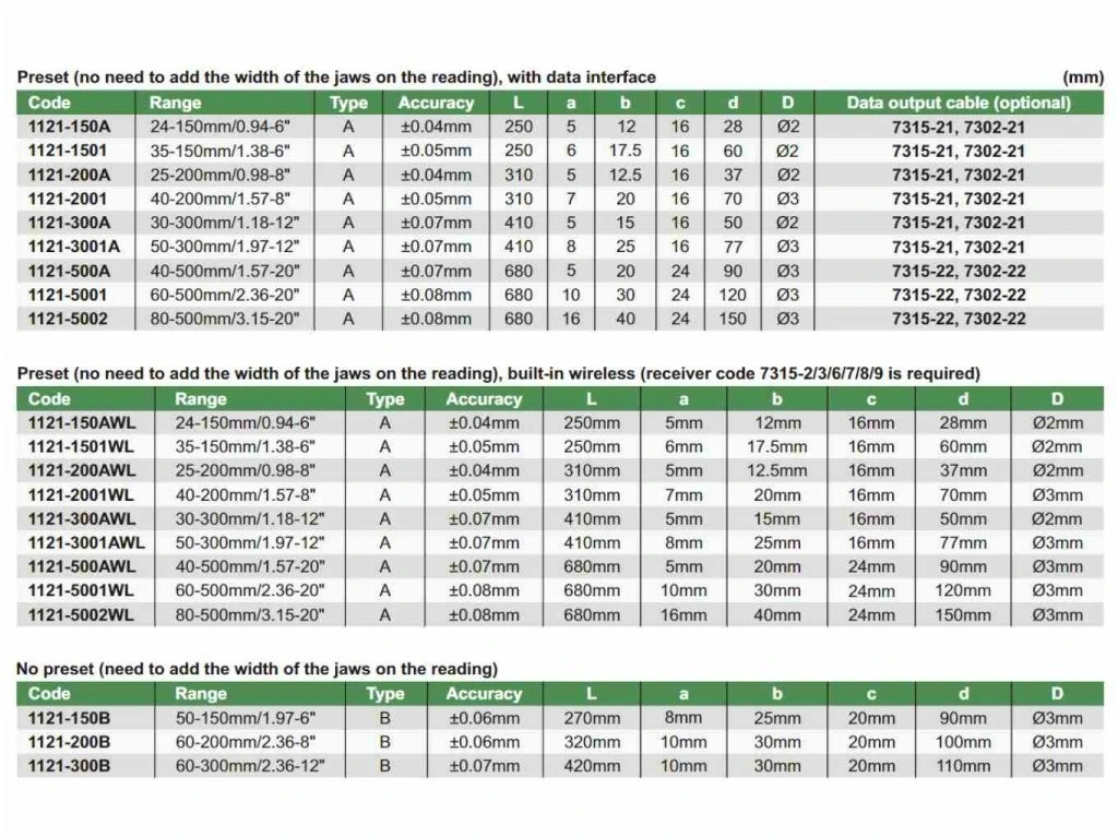 Ciocuri inferioare lungi: 120 mm, prevăzute cu vârfuri rotunde pentru măsurători interioare