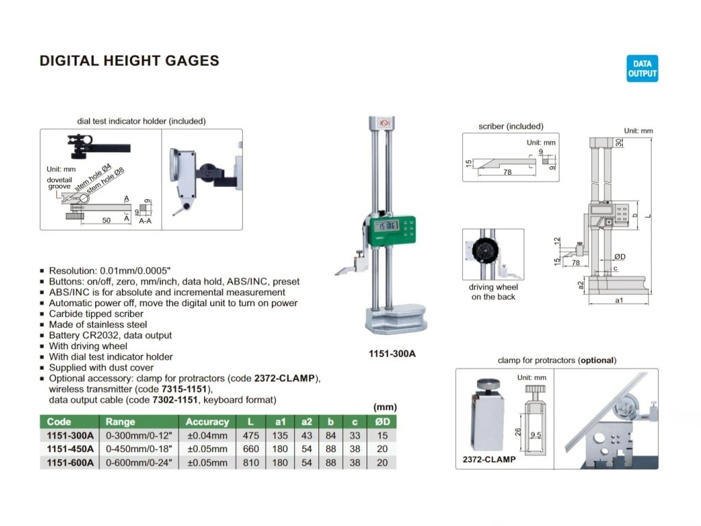 Sublerul digital de inaltime INSIZE 0-450 mm cu coloana dubla este un instrument profesional, realizat din otel inoxidabil, conceput pentru masuratori precise in ateliere si laboratoare. Dispune de varf pentru trasat din carbura, adaptor pentru ceasuri comparatoare si port de iesire date. Coloana dubla asigura stabilitate si precizie sporita in timpul masuratorilor.