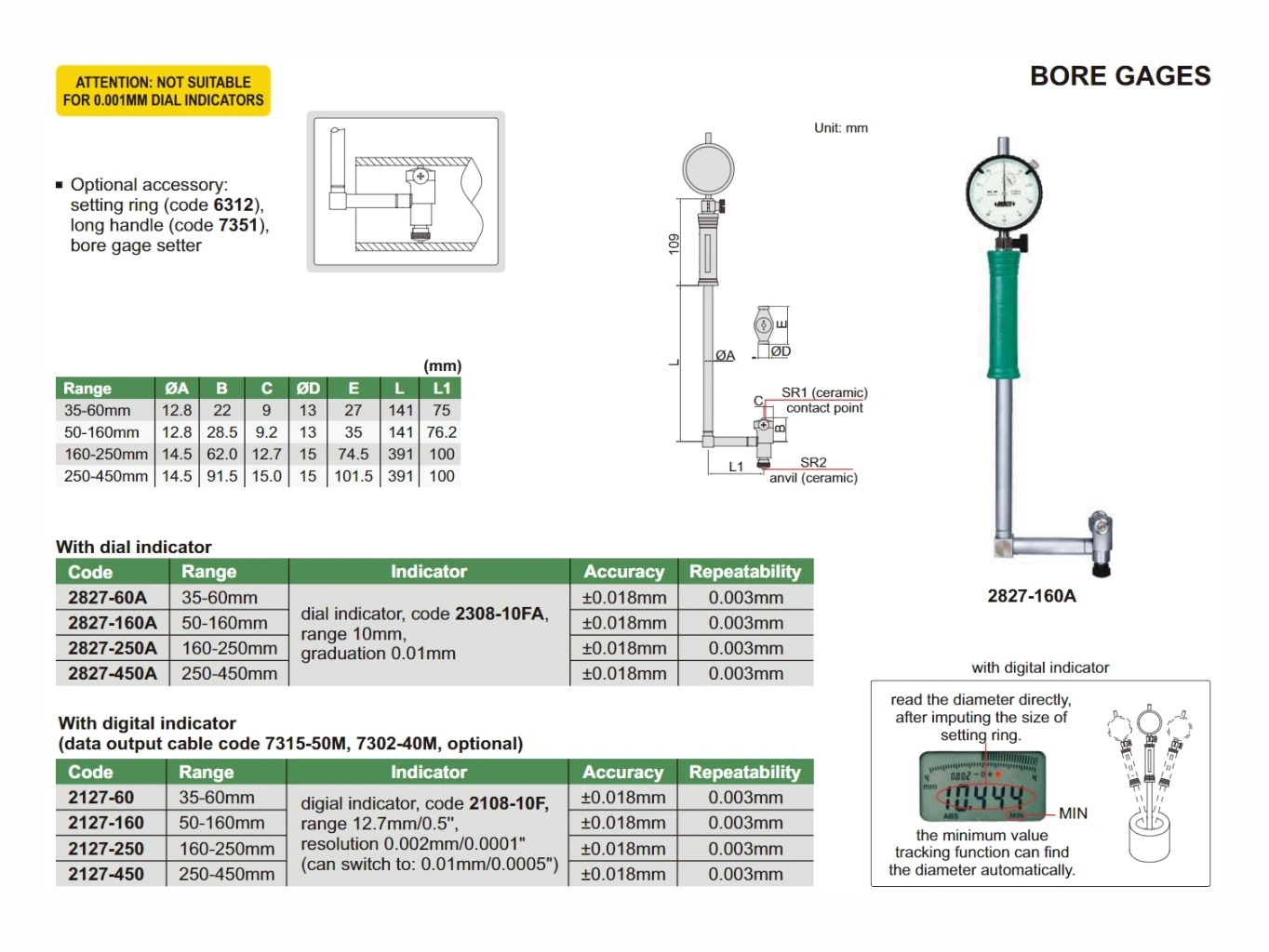 Acest model este proiectat sa masoare alezaje intr-un interval cuprins intre 35 si 60 mm. Punctul sau forte consta in ceasul comparator mecanic (cod 2308-10FA), care este detasabil si ofera o rezolutie de 0,01 mm pe un interval de masurare de 0-10 mm.